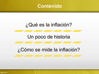 La inflación se define como el aumento generalizado de los precios causado por el crecimiento más rápido de la oferta monetaria en comparación con la oferta de bienes y servicios. Se mide principalmente a través del Índice de Precios al Consumidor, el cual monitorea los cambios en los precios de una canasta representativa de bienes y servicios. Históricamente, hubo altas tasas de inflación en países como Alemania en 1923, Bolivia en 1985, y Zimbabwe en 2007-2008. Actualmente, Venezuela experimenta una inflación anual del 56% según su