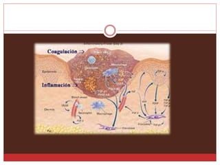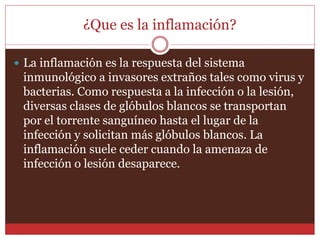La inflamación es la respuesta del sistema inmunológico a invasores como virus y bacterias. Involucra la dilatación de vasos sanguíneos, aumento del flujo sanguíneo y extravasación de líquido, así como la migración de glóbulos blancos al sitio de infección o lesión. Estos procesos son mediados por sustancias como la histamina y citoquinas, y tienen como objetivo eliminar la causa de daño y comenzar el proceso de reparación de tejidos.