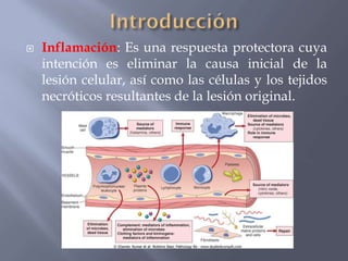 La inflamación es una respuesta protectora del cuerpo a una lesión o agente dañino que involucra cambios vasculares, acumulación de leucocitos y liberación de mediadores. Puede ser aguda o crónica. La inflamación aguda se caracteriza por la migración rápida de neutrófilos al sitio de lesión mediada por citocinas, quimioquinas y otras sustancias, mientras que la inflamación crónica implica una infiltración prolongada de macrófagos y linfocitos.