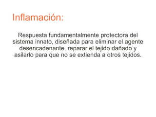 La inflamación es la respuesta protectora del cuerpo a los agentes dañinos que busca eliminarlos, reparar los tejidos y aislar la zona dañada. Consiste en cambios vasculares y la migración de leucocitos al área dañada, donde fagocitan y destruyen los agentes causantes. Puede ser aguda o crónica dependiendo de si se elimina o no la causa. La inflamación aguda sigue un proceso ordenado para combatir la infección y reparar los tejidos.