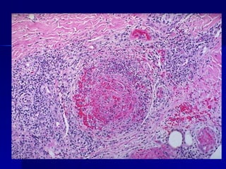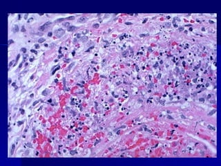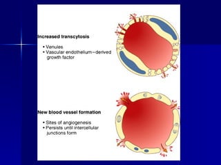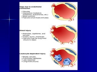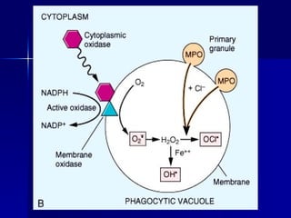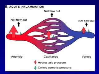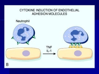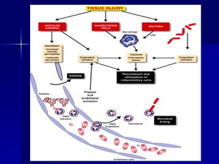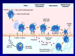 Este documento resume los principales conceptos relacionados con la inflamación aguda. Describe los fenómenos vasculares que ocurren durante la inflamación como la dilatación de los vasos, la marginación de los leucocitos y su extravasación a través de la pared vascular. También explica los diferentes tipos de células y mediadores involucrados en la respuesta inflamatoria aguda como los mastocitos, neutrófilos, citocinas y quimiocinas. Finalmente, resume las funciones de los principales leucocitos inflamatorios como los neutrófilos y