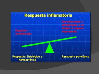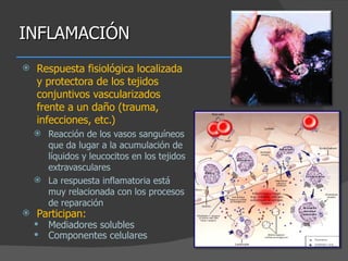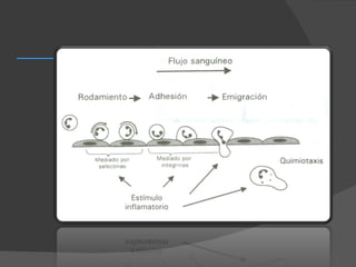 El documento resume los conceptos clave de la inflamación aguda. Describe que la inflamación aguda involucra cambios hemodinámicos como la vasodilatación, alteraciones en la permeabilidad vascular y modificaciones leucocitarias como la marginación, adherencia, emigración, quimiotaxis y fagocitosis mediadas por diversos mediadores moleculares como proteasas, lípidos, péptidos, óxido nítrico y citoquinas proinflamatorias. La resolución de la inflamación aguda implica la apoptosis de cé