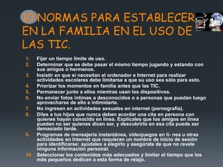Las 10 normas establecen límites de tiempo para el uso de dispositivos, priorizar momentos en familia sobre las TIC, supervisar el uso de los niños, evitar compartir información personal o visitar sitios inadecuados. Las tecnologías como Internet y los celulares han influido en la sociedad al cambiar las relaciones sociales y ser motores del crecimiento económico. Sin embargo, también han creado desigualdad debido a la brecha digital y falta de habilidades para usar y evaluar críticamente la tecnología. Mientras que ofrec
