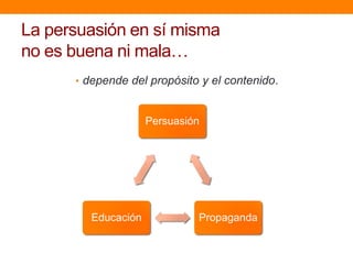 Este documento trata sobre la persuasión y resume algunos de sus elementos clave. Explica que la persuasión depende del propósito y contenido del mensaje, y no es inherentemente buena o mala. Luego describe dos rutas de persuasión, la central basada en argumentos racionales y la periférica basada en sensaciones, y factores como el comunicador, mensaje, canal y audiencia que influyen en su efectividad. Finalmente, analiza conceptos como la credibilidad, emoción vs razón, primacía y efecto de novedad.
