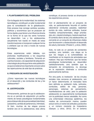 Este documento analiza la influencia de las nuevas tecnologías como Internet, teléfonos móviles y videojuegos en el desarrollo adolescente. Explica que los adolescentes usan estas tecnologías principalmente para fines recreativos y de comunicación, pero su uso excesivo puede afectar negativamente su desarrollo psicológico. También expone algunos riesgos como el ciberacoso a los que están expuestos los adolescentes online. El documento concluye recomendando monitorear el uso que hacen los adolescentes de las nue