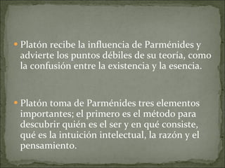 Platón se ve influenciado por la teoría de Parménides, adoptando tres elementos importantes: el método para descubrir la verdad a través de la intuición intelectual, la razón y el pensamiento; la teoría de los dos mundos sensible e inteligible; y el arte de la dialéctica. También acepta la oposición entre el conocimiento engañoso de los sentidos y el conocimiento verdadero de la razón, así como la distinción entre apariencia sensible y realidad auténtica.