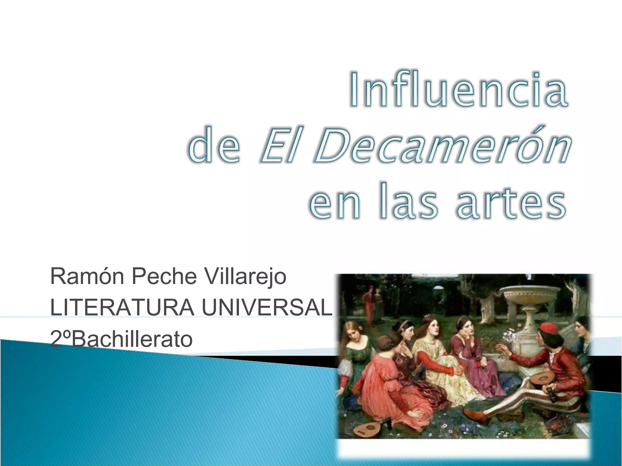 El documento resume la influencia y adaptaciones de la obra maestra de Boccaccio "El Decamerón". Se destaca que estableció un modelo literario imitado por escritores renacentistas y dio lugar al género de la novela cortesana. También ha inspirado obras pictóricas, musicales, teatrales y películas que recrean sus cuentos humorísticos y eróticos, como la famosa adaptación de Pier Paolo Pasolini.