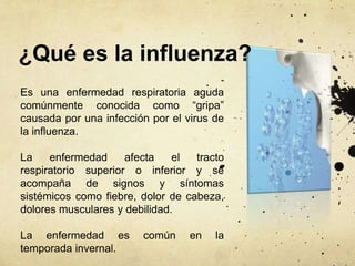 La influenza es una enfermedad respiratoria común causada por los virus de influenza A y B. Los síntomas incluyen fiebre, dolor de cabeza, tos y fatiga. Se transmite principalmente a través del contacto con gotitas respiratorias de personas infectadas. La vacuna contra la influenza se recomienda para grupos de alto riesgo como ancianos y trabajadores de la salud. El tratamiento se enfoca en aliviar los síntomas aunque existen medicamentos antivirales para reducir la duración de la enfermedad. Lavarse las manos