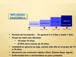 El documento proporciona información sobre la influenza A (H1N1), describiendo su naturaleza viral, tipos y características clínicas, como el periodo de incubación y los grupos de riesgo. Incluye protocolos para la identificación y manejo de casos sospechosos, métodos de diagnóstico, tratamiento recomendado y medidas de aislamiento en hospitales. También se destacan las complicaciones asociadas y la importancia de la vigilancia epidemiológica en la detección y control de brotes.