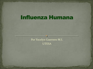 La influenza es una enfermedad respiratoria viral altamente contagiosa causada principalmente por los virus de tipo A e B. Se transmite de persona a persona a través de secreciones respiratorias. Las personas de alto riesgo como niños, ancianos y personas con enfermedades crónicas pulmonares corren mayor peligro de complicaciones. La vacunación anual y el lavado frecuente de manos son medidas importantes de prevención.