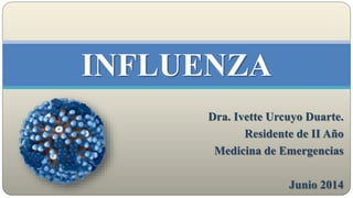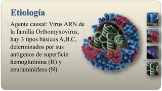 Este documento resume la etiología, transmisión, tipos y subtipos del virus de la influenza. Describe los mecanismos de cambio antigénico que conducen a epidemias estacionales y pandemias. Explica los métodos de diagnóstico, prevención y tratamiento de la influenza, incluidas las vacunas, medicamentos antivirales y quimioprofilaxis.