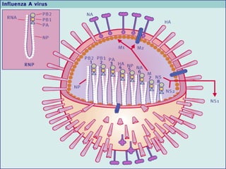 El documento habla sobre la influenza y los ortomixovirus. Explica que los ortomixovirus son los principales causantes de la morbilidad y mortalidad por enfermedades respiratorias y a veces causan pandemias. Describe los tres tipos de ortomixovirus (influenzavirus A, B y C), sus propiedades, proteínas clave como la hemaglutinina y la neuraminidasa, y su proceso de replicación y patogenia. También cubre temas como la epidemiología, diagnóstico, tratamiento y complicaciones de la influenza