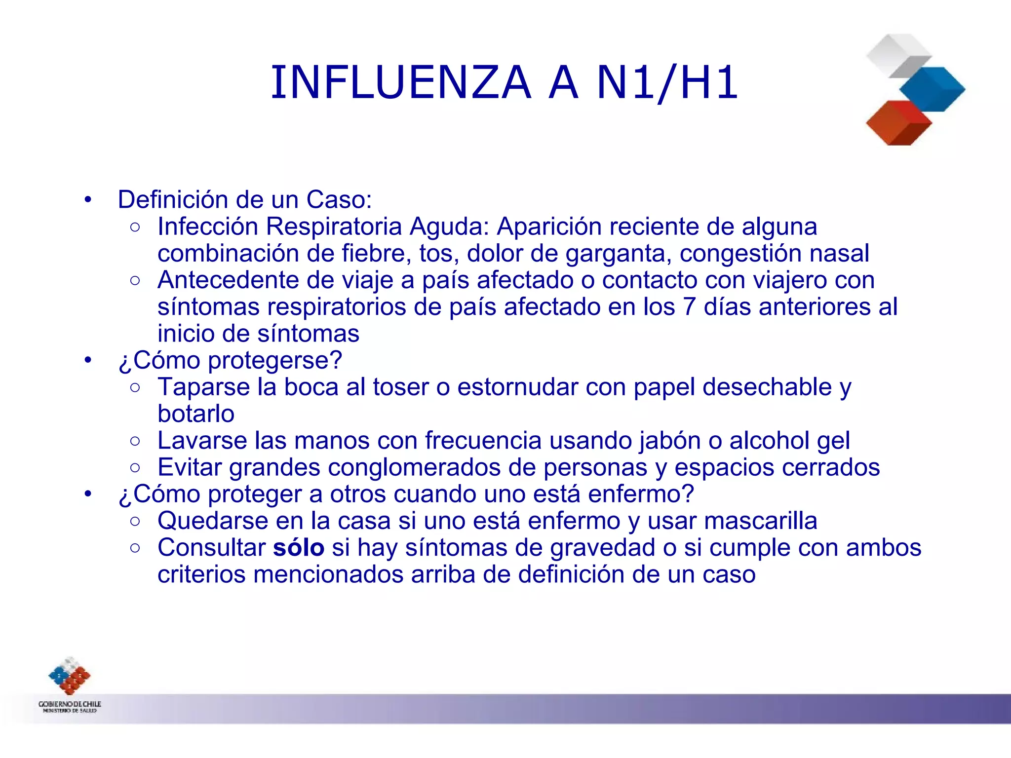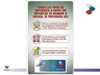 Este documento describe la influenza A N1/H1, incluyendo su definición, síntomas, y formas de protegerse y proteger a otros. La influenza A N1/H1 es una infección respiratoria aguda que se caracteriza por fiebre, tos, dolor de garganta u otros síntomas, especialmente si la persona ha viajado recientemente a un área afectada o ha estado en contacto con alguien con síntomas. Las personas deben cubrirse al toser o estornudar, lavarse las manos frecuentemente, ev