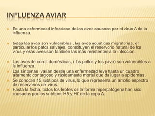 La influenza aviar es una enfermedad infecciosa de las aves causada por el virus A de la influenza. Afecta a todas las aves pero en especial a las aves acuáticas migratorias que son el reservorio natural del virus. En aves de corral como pollos y pavos puede causar cuadros desde leves hasta altamente contagiosos y mortales. Existen 15 subtipos del virus que representan un amplio espectro de reservorios. Hasta ahora, los brotes de forma hiperpatógena han sido causados por los subtipos H5 y H7