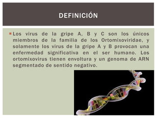 Los virus de la gripe A, B y C pertenecen a la familia Orthomyxoviridae, siendo solo los tipos A y B patógenos significativos para humanos. La gripe se transmite fácilmente en climas templados, afectando a los más vulnerables, y puede causar complicaciones graves como neumonía y síndrome de Reye. El diagnóstico se realiza a partir de síntomas y pruebas virales, mientras que la vacunación es la principal prevención, complementada por antivirales específicos.