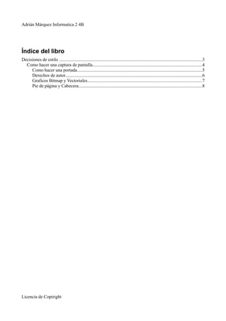 Este documento presenta un índice de contenidos para un libro sobre estilos de diseño de documentos. Incluye secciones sobre cómo hacer capturas de pantalla, portadas, derechos de autor, tipos de gráficos y pie de página y cabecera. El documento también especifica los estilos de formato para párrafos, títulos y licencia de copyright.