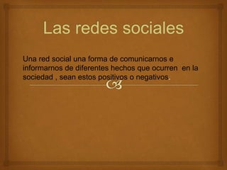 El documento habla sobre las redes sociales y su uso en la educación. Describe las diferentes tipos de redes sociales, como Facebook, Twitter y LinkedIn, y explica que los docentes deben diseñar estrategias efectivas para aprovechar las redes y facilitar la interacción con los estudiantes.