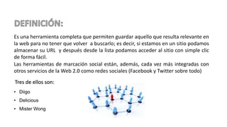 Este documento describe las características y funcionalidades de las herramientas de marcadores sociales como Diigo, Delicious y Mister Wong. Delicious es descrito como el líder en número de usuarios y el más sencillo de utilizar, permitiendo a los usuarios almacenar enlaces en la nube y compartirlos con otros a través de correo electrónico. Las herramientas de marcadores sociales permiten etiquetar contenidos para facilitar su posterior búsqueda y acceso por otros usuarios.