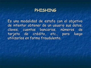 Este documento trata sobre el phishing y la protección de la identidad en línea. Explica que el phishing es un tipo de estafa donde los criminales conocidos como "phishers" intentan obtener información personal y financiera de usuarios haciéndose pasar por otras entidades. También describe algunos procedimientos para protegerse, como no dar información personal por correo, verificar el cifrado de sitios web y revisar saldos bancarios con frecuencia. Además, ofrece consejos para proteger la identidad de empresas como registrar marcas y dominios.