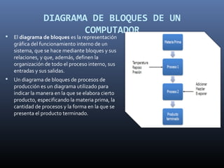 El documento describe los diferentes tipos de diagramas de bloques y arquitecturas de buses utilizados en computadoras. Explica que los diagramas de bloques muestran el funcionamiento interno de un sistema a través de bloques y sus relaciones, y que existen diagramas de procesos de producción y de modelos matemáticos. También describe diferentes tipos de buses como paralelos, seriales, IDE, USB, SATA y QPI, y sus características.