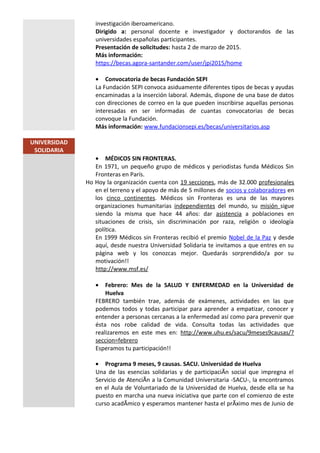 El boletín informa sobre varias convocatorias de ayudas, becas y cursos de la Universidad de Huelva y otras instituciones, incluyendo plazos y enlaces de información. También anuncia actividades culturales, talleres y descuentos disponibles para la comunidad universitaria. El SACU (Servicio de Atención a la Comunidad Universitaria) es el remitente y ofrece más detalles sobre sus servicios y cómo mantenerse informado.