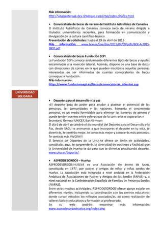 Este boletín resume varias noticias y eventos de interés para la comunidad universitaria, incluyendo convocatorias de becas, cursos, jornadas y concursos. Se destacan una convocatoria de becas del programa Matrícula, la actividad Geolodía 2015 y cursos de verano de la Universidad del País Vasco con becas disponibles. También se informa sobre diversos eventos formativos organizados por distintas entidades universitarias.