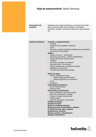 Este documento resume las coberturas básicas y opcionales de una póliza de seguros para locales de servicios. Entre las coberturas básicas se incluyen daños por incendio, explosión, humo, agua, fenómenos atmosféricos y otros riesgos. También incluye coberturas adicionales como responsabilidad civil, robo, pérdida de alquiler y asistencia jurídica. Entre las ventajas se destacan un amplio abanico de coberturas, límites amplios y