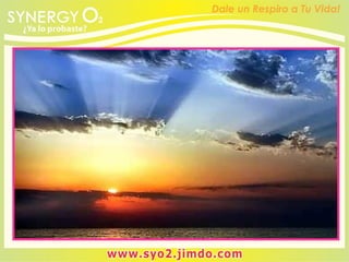 El documento promueve el uso de Synergy O2, un oxígeno líquido que compensa la deficiencia de oxígeno en el cuerpo humano, que ha disminuido a niveles alarmantes debido a la contaminación y el estilo de vida moderno. Se presenta como una solución para diversos problemas de salud, mejorando la oxigenación celular, el sistema inmunológico, y ayudando a la desintoxicación. Synergy O2, formulado con minerales y electrolitos, fomenta el bienestar general y se recomienda como complemento nutricional.