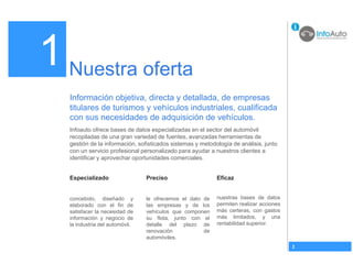 Este documento describe los servicios de información y bases de datos que ofrece Infoauto para ayudar a las empresas a identificar oportunidades comerciales en el sector del automóvil. Infoauto proporciona bases de datos especializadas con información sobre empresas titulares de vehículos industriales y turismos, incluyendo detalles sobre sus flotas de vehículos y plazos de renovación. También ofrece herramientas para cualificar y enriquecer estas bases de datos, así como servicios de generación de leads y scores de propensión al consumo de vehículos para ident