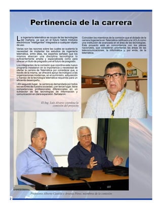 El documento resume los planes de la Universidad Centroccidental "Lisandro Alvarado" para comenzar un programa de Ingeniería en Telemática en el primer semestre de 2014. La carrera se dictará de manera bimodal, presencial y a distancia. Una comisión se formó para establecer los lineamientos y la carrera responderá a las políticas nacionales de desarrollo científico-tecnológico. La carrera aprovechará las tecnologías emergentes y satisfará la demanda de profesionales en este campo