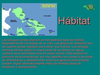 La tortuga verde alterna entre tres hábitats dependiendo de su etapa de vida: playas de anidación donde pone sus huevos, aguas costeras poco profundas ricas en pasto marino donde pasan la mayor parte del tiempo como adultas, y áreas de alimentación y apareamiento selectivas entre generaciones. Se alimentan principalmente de pasto marino y macroalgas como adultas, aunque las más jóvenes también comen invertebrados marinos pequeños; su dieta se vuelve completamente herbívora con la edad. Están en peligro de extin
