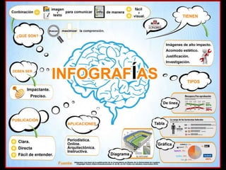 La infografía es un diseño gráfico que combina texto y elementos visuales para comunicar información de manera precisa y ágil sobre diversas temáticas. Existen diferentes tipos de infografías, como gráficas separadas e integradas, que se utilizan para contar o complementar información. La infografía digital ha emergido como una herramienta poderosa en el periodismo contemporáneo, facilitando la presentación de datos de manera más visual y dinámica.