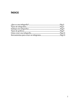 Este documento describe los tipos de infografías, incluyendo infografías científicas, de divulgación y periodísticas. Explica los subtipos como descriptivas, estadísticas y secuenciales. También detalla los diferentes tipos de gráficos usados en infografías como gráficos de barras, radiales, integrados y de torta.