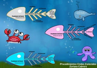 El documento es una infografía sobre los procedimientos civiles especiales, elaborada por Zoraina Cabrera para la Escuela de Derecho de la Universidad Fermín Toro. Se menciona que el trabajo está bajo la supervisión de la profesora Dailyn Colmenares. La bibliografía incluye el Código de Procedimiento Civil de 1990, publicado en la Gaceta Oficial de Venezuela.
