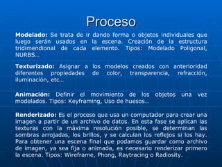 El documento describe el software de infografía 3D. Explica que permite modelar proyectos en 3D antes de su construcción real. Detalla los pasos del proceso como modelado, texturizado, animación y renderizado. Luego describe los principales programas como 3D Studio Max, Lightwave 3D, Maya y SoftImage XSI, explicando sus características, versiones actuales y fabricantes.