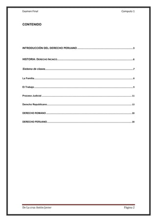 El documento presenta una introducción al derecho peruano, incluyendo una descripción de las culturas preincaicas y del derecho incaico. Resume que las culturas preincaicas probablemente tuvieron sistemas normativos no escritos, y que el Imperio Inca tuvo un sistema de clases y leyes que regulaban la familia, el trabajo y el proceso judicial.