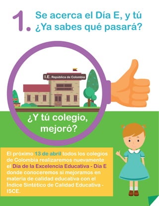El documento habla sobre el Día E, que es el Día de la Excelencia Educativa en Colombia cuando se darán a conocer los resultados del Índice Sintético de Calidad Educativa (ISCE) para cada colegio. El ISCE mide la calidad educativa y tiene una escala del 1 al 10, evaluando cuatro componentes: desempeño, progreso, eficiencia y ambiente escolar. El 13 de abril se revelarán los resultados de 2016 que mostrarán si los colegios mejoraron en relación con 2015 y alcanzaron las metas propuestas.