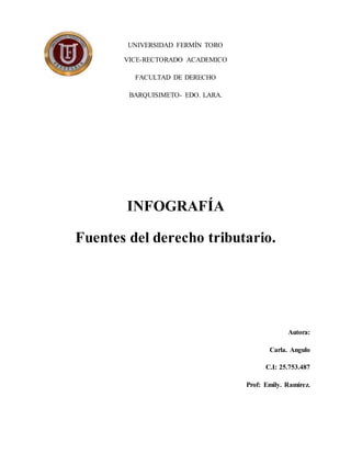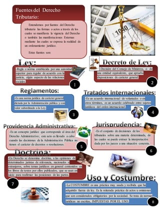 Este documento define las fuentes del derecho tributario como las formas a través de las cuales se manifiesta la vigencia del derecho tributario. Describe las principales fuentes como la ley, el decreto, la resolución, los tratados internacionales, la jurisprudencia, la doctrina y la costumbre. También explica brevemente el ámbito de aplicación de las normas tributarias en el tiempo y el espacio, así como los principios de interpretación de las leyes tributarias y el concepto de vacatio legis.