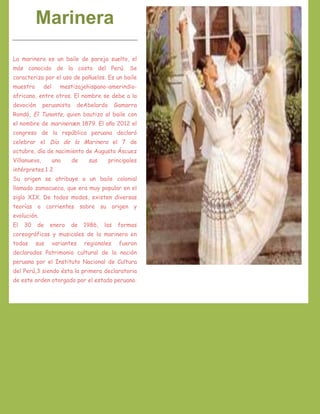 La marinera es un baile típico peruano de pareja suelto que se caracteriza por el uso de pañuelos. Tiene orígenes en el mestizaje hispano-amerindio-africano y se le atribuye haber evolucionado de un baile colonial llamado zamacueca. En 1986, las formas coreográficas y musicales de la marinera fueron declaradas patrimonio cultural de la nación peruana.