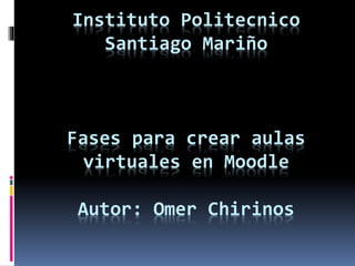Este documento describe las cuatro fases para crear aulas virtuales en Moodle: 1) Planificación, que permite organizar la secuencia de aprendizaje para obtener los resultados deseados; 2) Elaboración, donde se desarrolla la estructura de contenidos organizados temporalmente; 3) Seguimiento, que es la fase principal donde el tutor da seguimiento al trabajo del estudiante de forma personalizada; y 4) Evaluación, donde se evalúa el proceso y producto y se recomiendan mecanismos de retroalimentación.