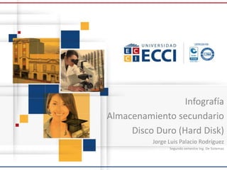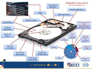 El documento describe los componentes principales de un disco duro, incluyendo los platos, la película magnética, el motor, la cabeza lectora, la placa de circuitos, y la terminal SATA. Explica que estos componentes trabajan juntos para almacenar y recuperar datos del disco duro a través de sectores, pistas y clústeres.