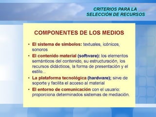Los recursos didácticos son elementos fundamentales en el proceso de enseñanza-aprendizaje, ya que facilitan la interacción entre docentes y estudiantes, ayudan a ejercitar y desarrollar habilidades, y permiten evaluar conocimientos. Abarcan diversos tipos de materiales, incluyendo audiovisuales, informativos y básicos, cuyo uso debe estar planificado dentro de la programación educativa. Además, su selección debe considerar criterios específicos para asegurar su efectividad en el logro de objetivos educativos.