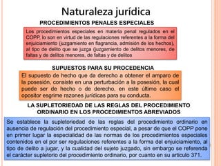 El documento resume los procedimientos penales especiales establecidos en el Código Orgánico Procesal Penal de Venezuela. Estos procedimientos se aplican según la forma del enjuiciamiento, el tipo de delito o la calidad del sujeto juzgado. Entre ellos se encuentran la flagrancia, la admisión de los hechos y el procedimiento especial para juicios contra el Presidente de la República y altos funcionarios del Estado. El Tribunal Supremo de Justicia es el órgano competente para conocer el antejuicio de mérito en estos últimos casos.