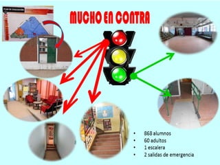 El documento habla sobre la accesibilidad en una escuela, notando que aunque hay algunas rampas y un futuro ascensor planeado, actualmente hay muchas escaleras y desniveles que no permiten la accesibilidad para todos. Se sugiere que la salida de emergencia debería mejorarse con una rampa para ser más accesible.