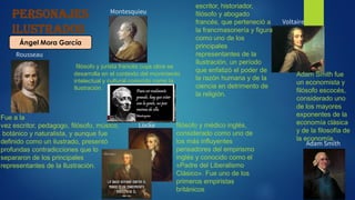 El documento describe a varios personajes ilustrados como Montesquieu, Rousseau, Voltaire y Locke, así como a Adam Smith. Montesquieu fue un filósofo y jurista francés cuyo trabajo se desarrolló en el contexto de la Ilustración. Rousseau fue un filósofo, pedagogo, músico y naturalista suizo que presentó contradicciones con la Ilustración. Voltaire fue un escritor, historiador y filósofo francés que perteneció a la francmasonería y representó la