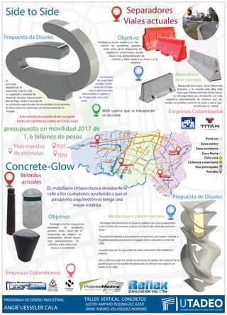 Este documento describe una propuesta de diseño de separadores viales de concreto. El objetivo principal es mejorar el diseño de los separadores viales actuales en el mercado para proteger y recibir impactos en caso de accidentes. La propuesta incluye separadores de concreto con diferentes ángulos y alturas para organizar el tránsito, separar sentidos de flujo y redirigir vehículos en caso de choques. La propuesta busca beneficiar tanto a carreteras como ciclorutas y favorecer la seguridad de peatones y c