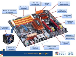 La infografía describe los principales componentes de una placa base, incluyendo el procesador, memoria, puertos, ranuras y chips. Explica brevemente la función de cada uno y cómo se interconectan para que la computadora funcione.