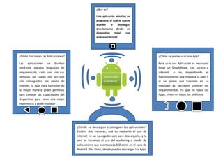 El documento habla sobre aplicaciones móviles. Explica que una aplicación móvil es un programa que se puede acceder o descargar directamente desde un dispositivo móvil con acceso a internet. Detalla que para usar una aplicación se necesita un smartphone con acceso a internet y conocer los requerimientos de cada aplicación. Además, comenta que las aplicaciones se diseñan usando lenguajes de programación y piden permisos para funcionar mejor aprovechando las capacidades del dispositivo. Por último, señala que las aplicaciones se pueden descargar desde internet o ti