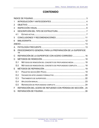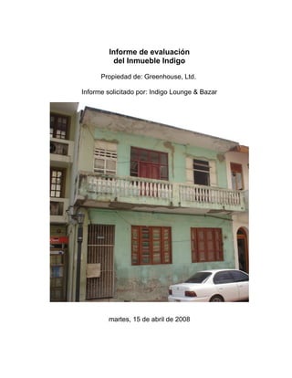 Este informe presenta los resultados de una inspección realizada al Inmueble Indigo. La inspección encontró daños estructurales como corrosión del acero de refuerzo y fisuras, principalmente en elementos cercanos al mar. Se recomienda reparar estos daños siguiendo técnicas descritas en el anexo, así como reemplazar elementos del techo deteriorados, antes de realizar adecuaciones para uso comercial de la planta baja.