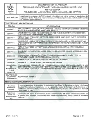 Este documento describe un programa de formación para técnicos en administración de redes de computadores. El programa dura 24 meses y busca capacitar a los aprendices en tecnologías de cableado estructurado, centros de datos, redes alámbricas e inalámbricas y seguridad en redes, para que puedan crear y dar soporte a infraestructuras de TI que satisfagan los objetivos de negocio del sector productivo. El programa cubre temas como diseño de redes, administración de hardware y software de red, y configuración de dispositivos